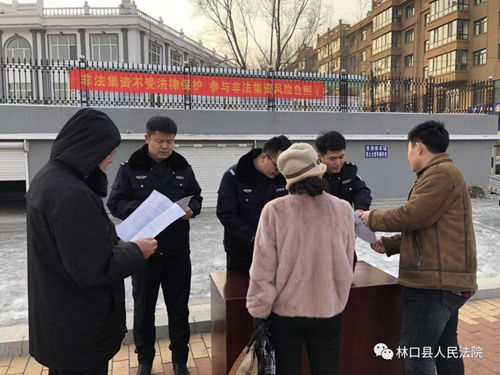 林口县人民法院将针对非法集资表现形式和特点,充分利用各种宣传手段,加大宣传力度和受众群体,充分发挥司法审判工作和社会预防功能,提高群众的风险防范意识,确保宣传活动可以取得实效,以保障人民群众的合法权益。