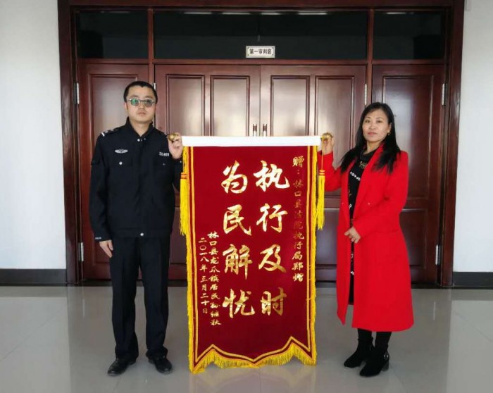 21日上午,家住林口县龙爪镇保安村三队的申请执行人孙某将一面写有“执行及时,为民解忧”的锦旗送到了林口县人民法院,以表达对执行人员郑熠的感激之情。