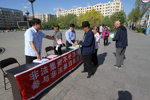 法院干警在兴林广场发放宣传手册、宣传单,对大家进行讲解,提醒他们要树立正确的理财观念,自觉抵制各种形式的非法集资活动,避免遭受损失。