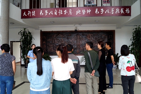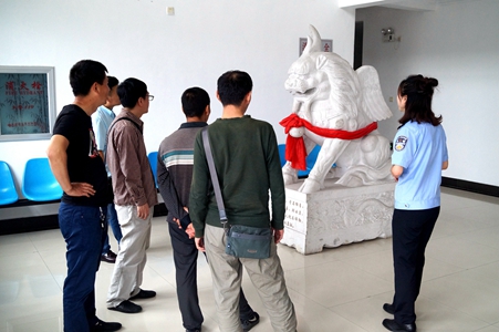 国土局职工一行在讲解员的带领下分别参观了警队文化建设、文化走廊、体能训练室、院史馆、第一审判庭等地。在文化走廊,不同的主题春夏秋冬墙寓意着林口县法院发展的不同阶段;墙上的“百德图、百法图、百廉图、百新图”,不同的字体蕴含着不同的含义,引起了到访者的浓厚兴趣。第一审判庭前陈列的独角兽獬豸,它拥有很高的智慧,懂人言知人性。它怒目圆睁,能辨是非曲直,能识善恶忠奸又有神羊之称,它是勇猛、公正的象征,是司法“正大光明”“清平公正”“光明天下”的象征。