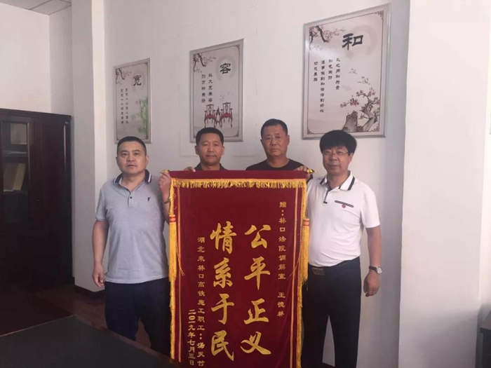 一场紧张对立的矛盾纠纷,在诉前调解室工作人员的努力下,在诉讼前得到了有效化解,受害人汤某激动之情溢于言表,在其已经离开林口返乡途中,还专门委托亲友给人民调解员王德林同志送来了锦旗:情系于民、公平正义。以此深切表达他的感激之情。