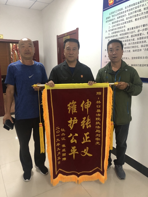 近日,申请人崔某带着一面印有“伸张正义 维护公平”的锦旗来到林口县人民法院执行警务局,以表达对执行干警刘宗光尽职尽责的感激之情。