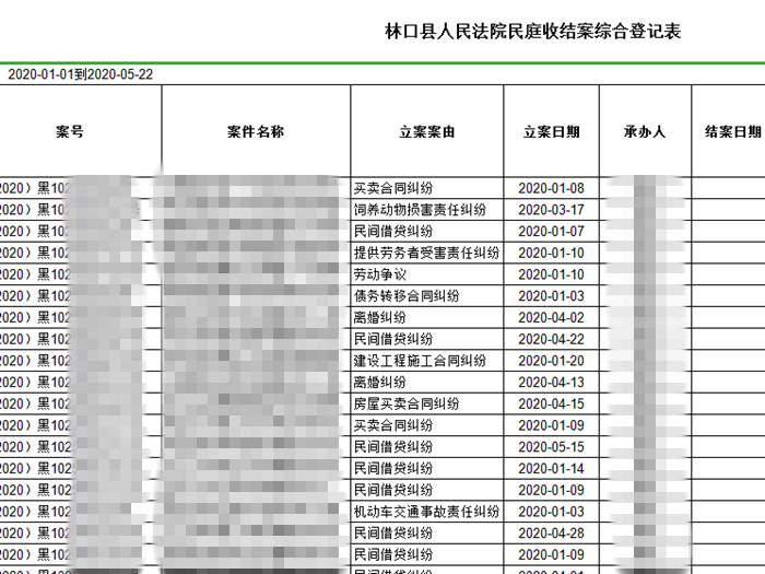 二是梳理民商事案件。要求各员额法官梳理手中案件,制作收结案情况统计表,形成《林口县法院民庭收结案综合登记表》,登记表综合了案号、案由、承办人、结案日期等内容,一目了然,便于及时了解民商事案件推进情况。