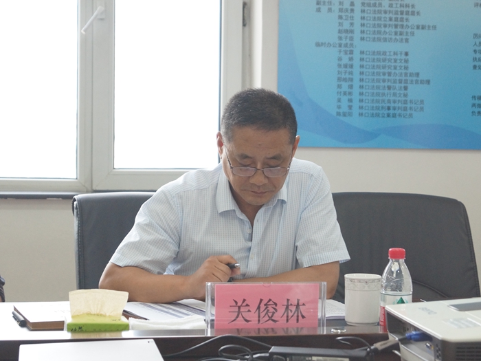 7月28日下午,牡丹江市人大监察和司法委员会主任委员关俊林一行6人莅临林口县人民法院就近三年更审改判案件情况开展调研,并召开座谈会。市中院审判管理办公室主任王昱陪同调研。林口县法院党组书记、院长孙凯、党组成员、副院长侯立卿、党组成员、政工科科长刘晶、审管办负责人刘芳及各业务庭室负责人参加会议。