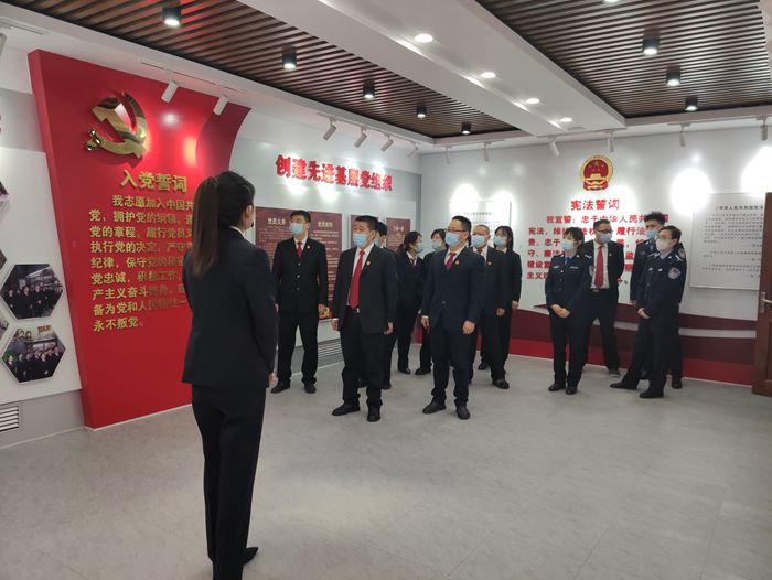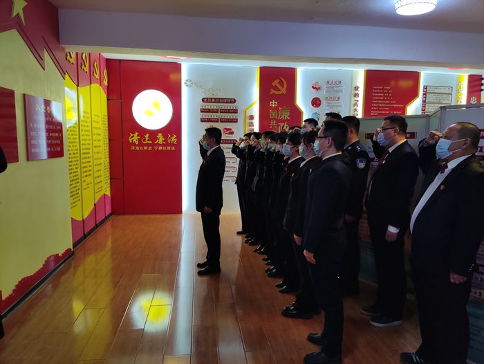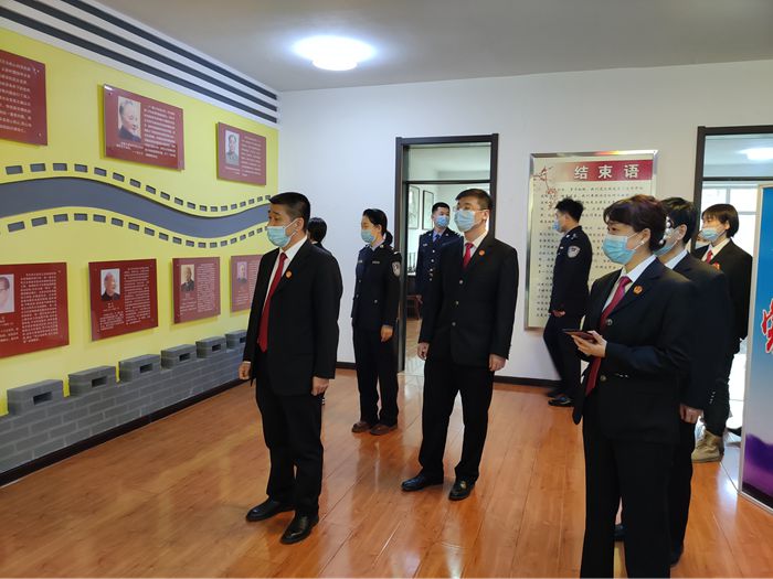 在林口县廉政教育基地,法院干警通过参观,进一步了解了我国在反腐败斗争中所取得的伟大胜利,也了解了腐败分子的沦陷过程、犯罪细节等。最后,侯立卿副院长带领党员干警面向党旗,重温了入党誓词。