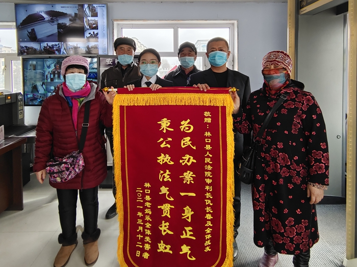 3月16日,林口县林口镇居民王某某等4人代表82名被害人将一面书有“为民办案一身正气,秉公执法气贯长虹”的锦旗送到了林口县法院,他们一边将锦旗送到刑事审判庭法官仇长春及工作人员的手中,一边说道:“感谢法院,感谢法官秉公执法,保护了咱们老百姓的权益……”。