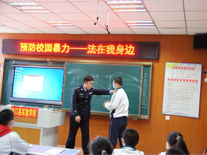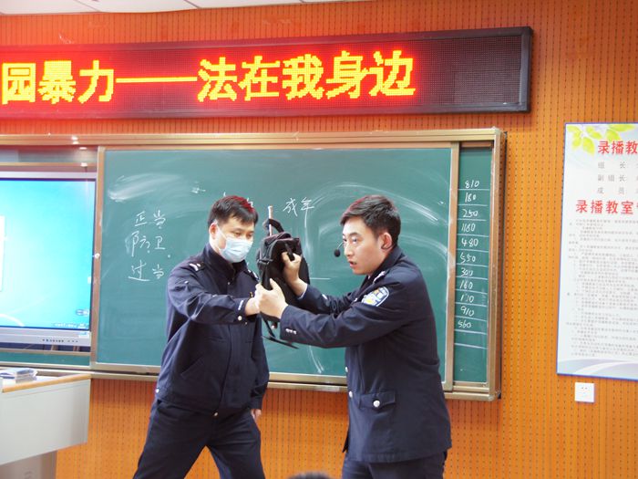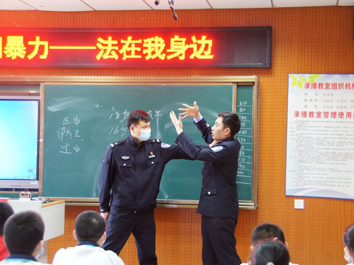 司法警察杨宇健以《未成年面对暴力侵害应急技巧》为主题,从极易发生在学生之间的校园暴力入手,通过情景引入的方式,引导同学们加强自我保护、遵纪守法、远离犯罪,提高自我保护意识和能力,在遇到暴力侵害时,通过防卫技巧和冷静的头脑来维护自身的安全,切实增强了青少年应对暴力侵害的防御能力。