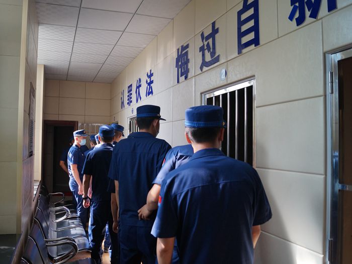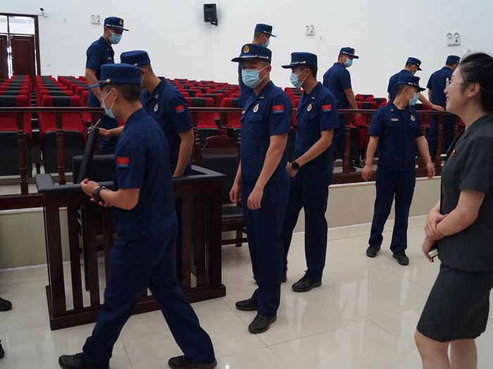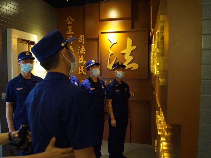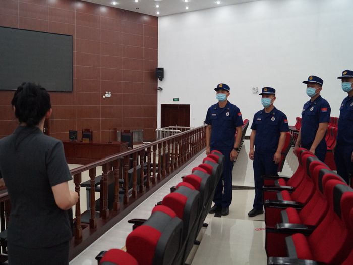 在讲解员的带领下,战士们首先来到第一审判庭、羁押室等地,讲解员详细介绍了审判工作流程及羁押室收押注意事项等。