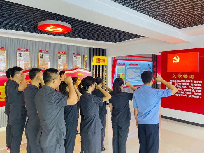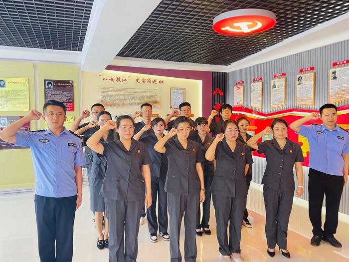 在鲜红的党旗前,干警庄严地举起右拳宣誓,整齐的声音、饱满的热情、昂扬的斗志提醒着每个党员牢记誓言、坚守初心、忠诚信仰,永葆共产党员的政治本色。这是每一个党员都经历过的庄严神圣的仪式,重温入党誓词,坚定为民服务的理念,让红色基因永远传承。