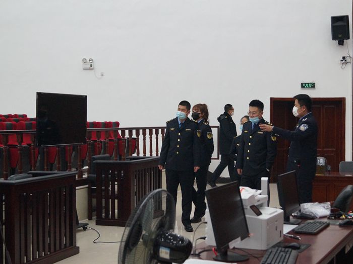 应急管理局一行5人在法警队副队长柏彦斌的带领下,参观了安检大厅、第一审判庭、羁押室、法警文化长廊等地,对法院的工作氛围、工作流程有了进一步了解。