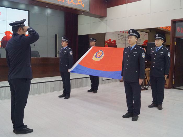 司法警察面向警旗,警容严整,精神振奋,高举右手,以最洪亮的声音庄严宣誓,大家神情坚毅,把对党和人民,对司法事业的无限忠诚和热爱都凝聚在铮铮誓词中。