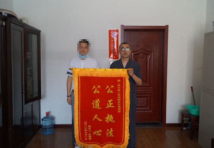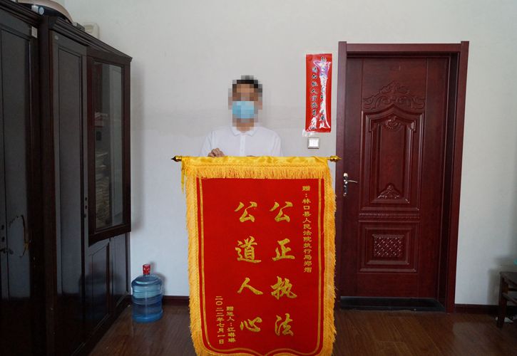 近日,林口县法院执行干警收到一面印有“公正执法 公道人心”的锦旗,以此表达对执行干警郑熠的感激之情。
