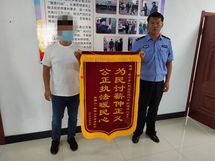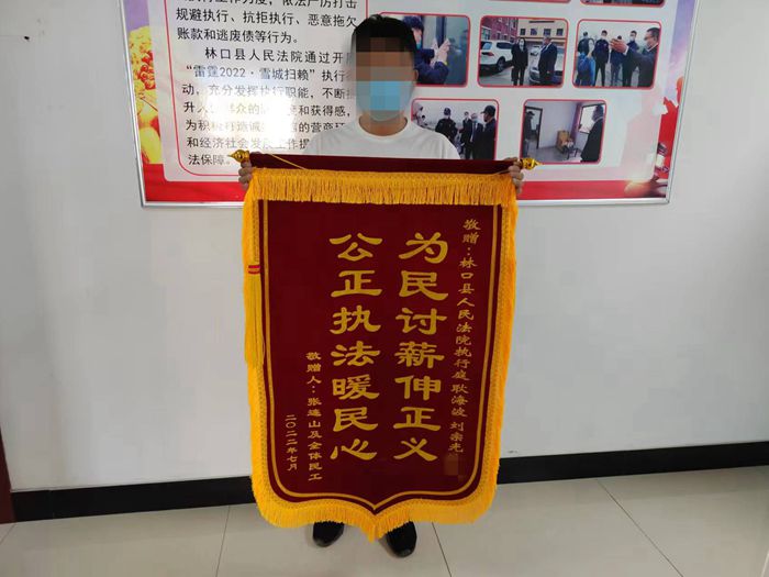 近日,林口县法院执结一起为农民工讨薪的案件,收到案款的他们为感谢执行干警,送来一面印有“为民讨薪伸正义 公正执法暖民心”的锦旗。