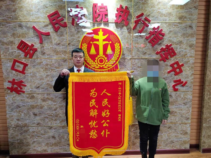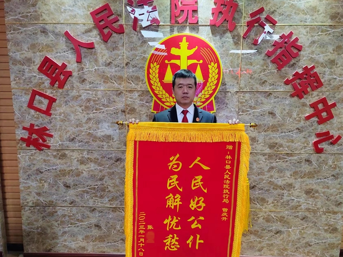 近日,林口县居民张某给林口县法院执行局执行干警送来一面印有“人民好公仆 为民解忧愁”字样的锦旗,赞扬执行干警尽职尽责的工作态度和公正为民的司法精神。