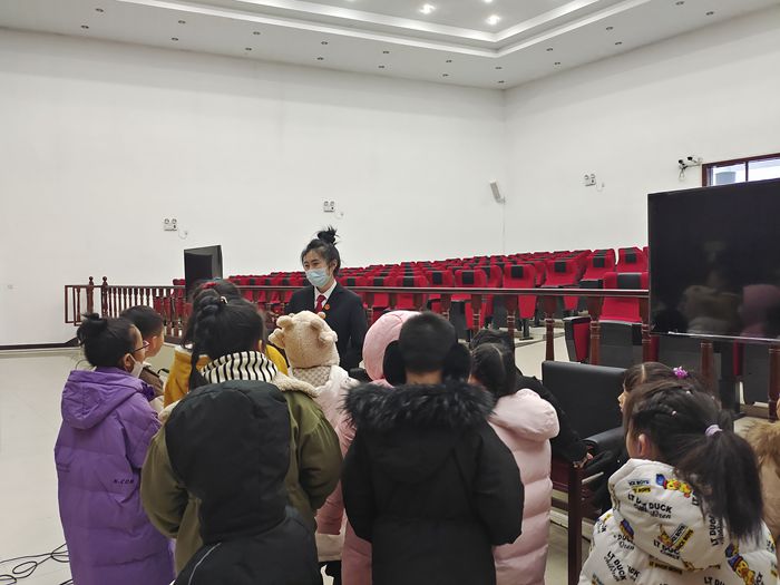 在审判庭,同学们认真聆听了讲解员对法徽、法槌、法袍的用途和象征意义的讲解,通过现场问答的方式让同学们对法院有了更进一步的了解,同时以小故事的方式教育引导学生们遵纪守法、不断增强自我的保护意识和能力。
