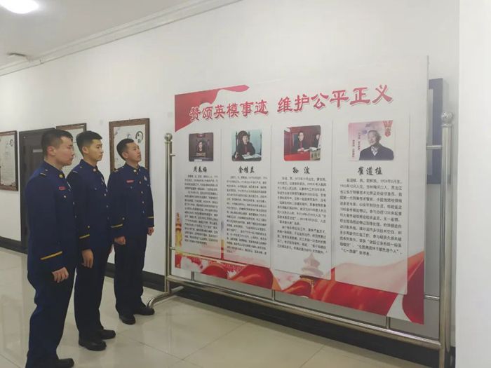 在干警的引导下,森警战士们先后参观了审判庭、浮雕墙、文化长廊、院史馆等场所,直观了解了林口县人民法院办公楼整体结构。