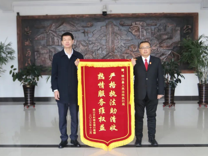 近日,林口县农村商业银行为林口县法院执行局送来印有“严格执法助清收 热情服务维权益”的锦旗,对执行局严谨高效又尽心尽力地执行案件,帮助其纾困解难表示由衷感谢。