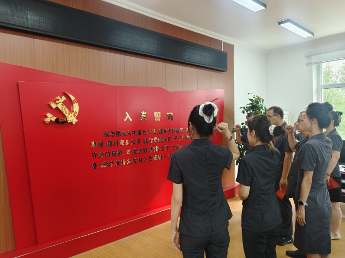 全体党员整齐列队,高举右拳,在领誓人的带领下,重温入党誓词。“我志愿加入中国共产党……随时准备为党和人民牺牲一切,永不叛党。”铿锵有力的誓言,字字千钧,让每一位党员的心灵再次受到震撼和洗礼,更加坚定了为共产主义事业奋斗终身的决心。