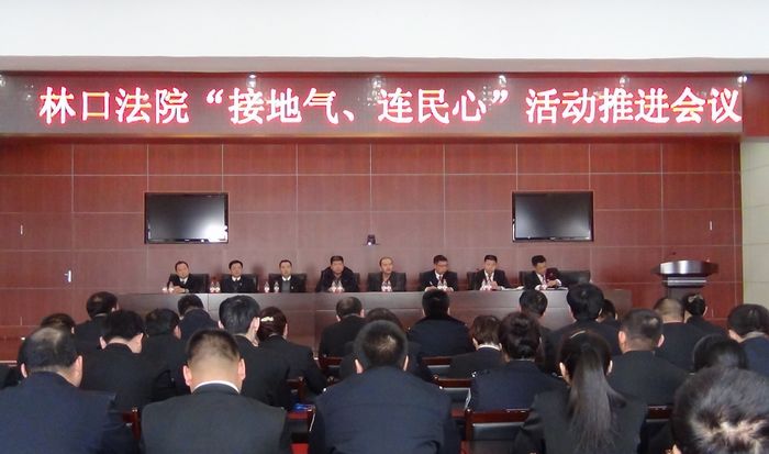 一斧为启动“快”,浓化“接连”氛围。即全县“接连”工作启动大会之后,林口法院召开全院干警大会迅速落实县委会议精神。院长关俊林就活动呼应的三大背景和一个重大命题进行了解读,就活动要解决的决策力的问题、公信力的问题、战斗力的问题、凝聚力的问题、决胜力的问题进行了深刻的阐述,提出了“向党组看齐、全院动员、人人参与、立足审判、迅速切入、务求实效”的工作目标,按照启动会议的部署各审判庭、基层法庭通过主楼的电子屏幕,林口法院的内外网纷纷发出倡议:人民法官要做接地气、连民心的先行者,要做便民利民的实践者、要做能动司法的推动者。接地气、连民心主题实践活动已在全院上下形成了浓烈的工作氛围。
