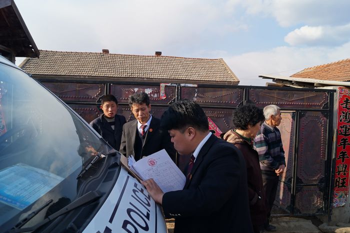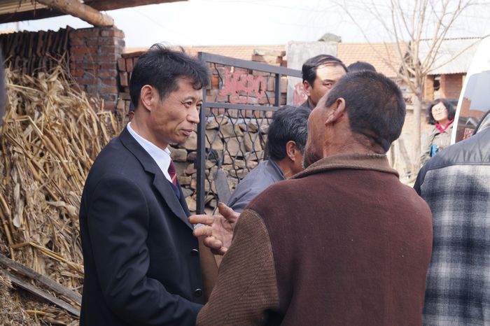 4月4日刁翎法庭庭长孙公祥携两名人民陪审员历时3个多小时风尘仆仆来到原告家中。